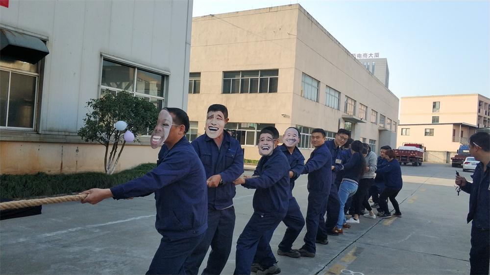 再來蛟龍出海團體項目,6個隊員并排站成1排,每個人的左右腿都和他左右兩個人的右腿和左腿用綁腿繩綁在一起,形成三人四足的樣子。這是一個需要團隊協(xié)作才能完成的項目,最終脫模布車間的膜力四射隊取得了冠軍。